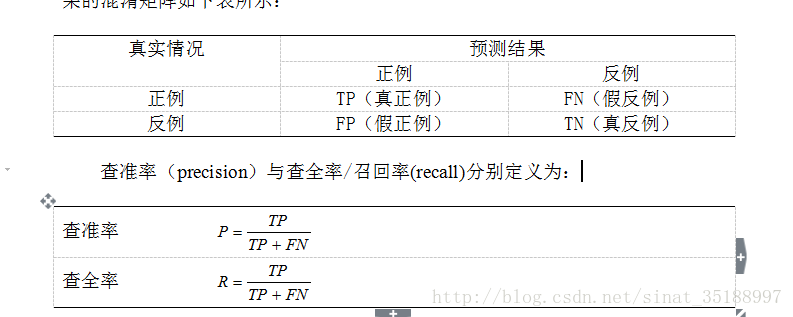 对于二分类问题,可将样例根据其真实类别与学习器预测类别的组合划分为真正例(TP,true positive),假正例(FP,false positive),真反例(TN,true negative),假反例(FN,false negative)四种情形。显然有TP+FP+TN+FN=样例总数。分类结果的混淆矩阵如下表所示: