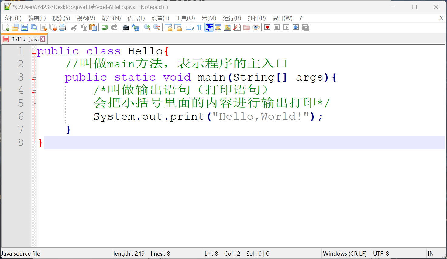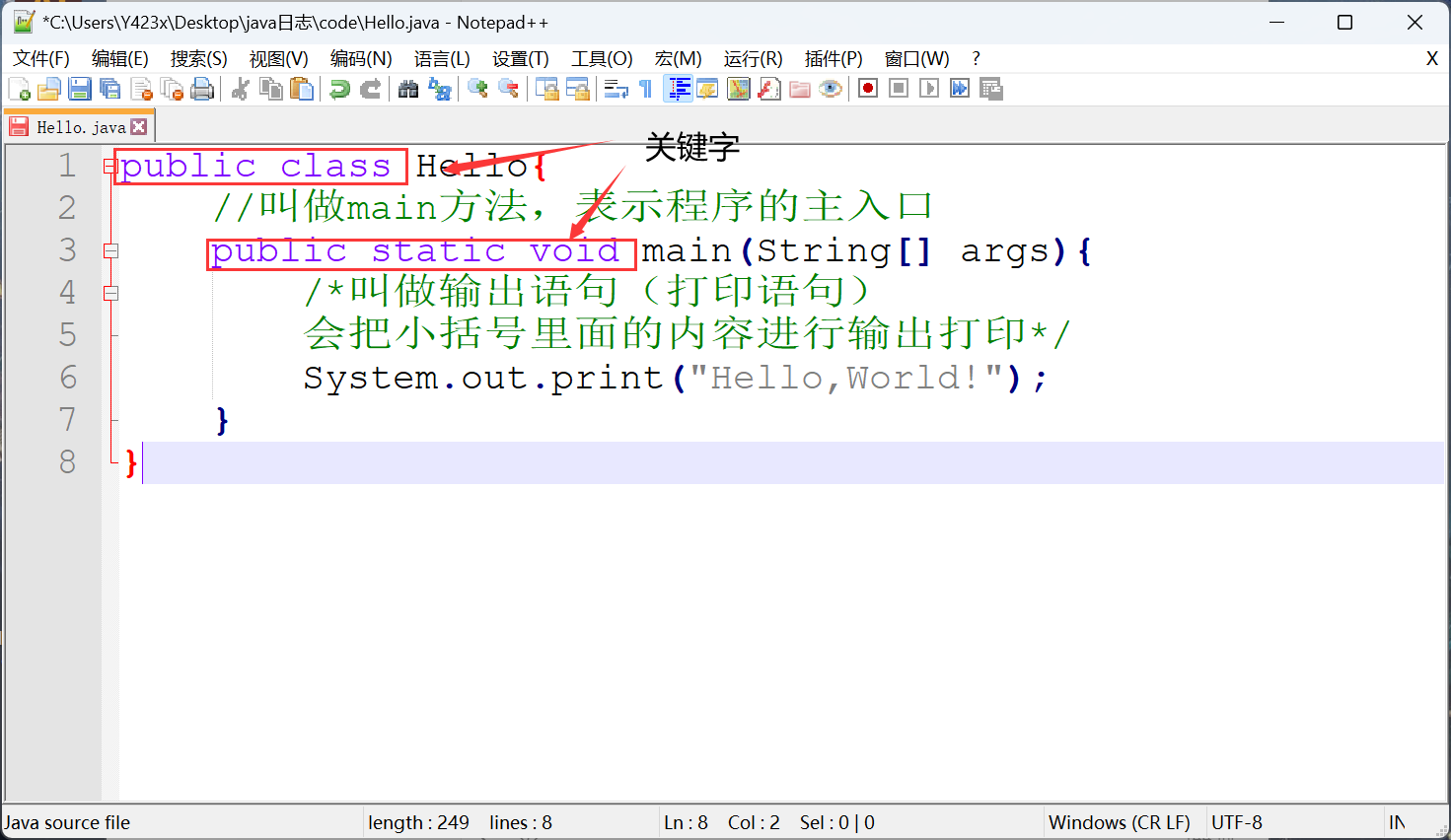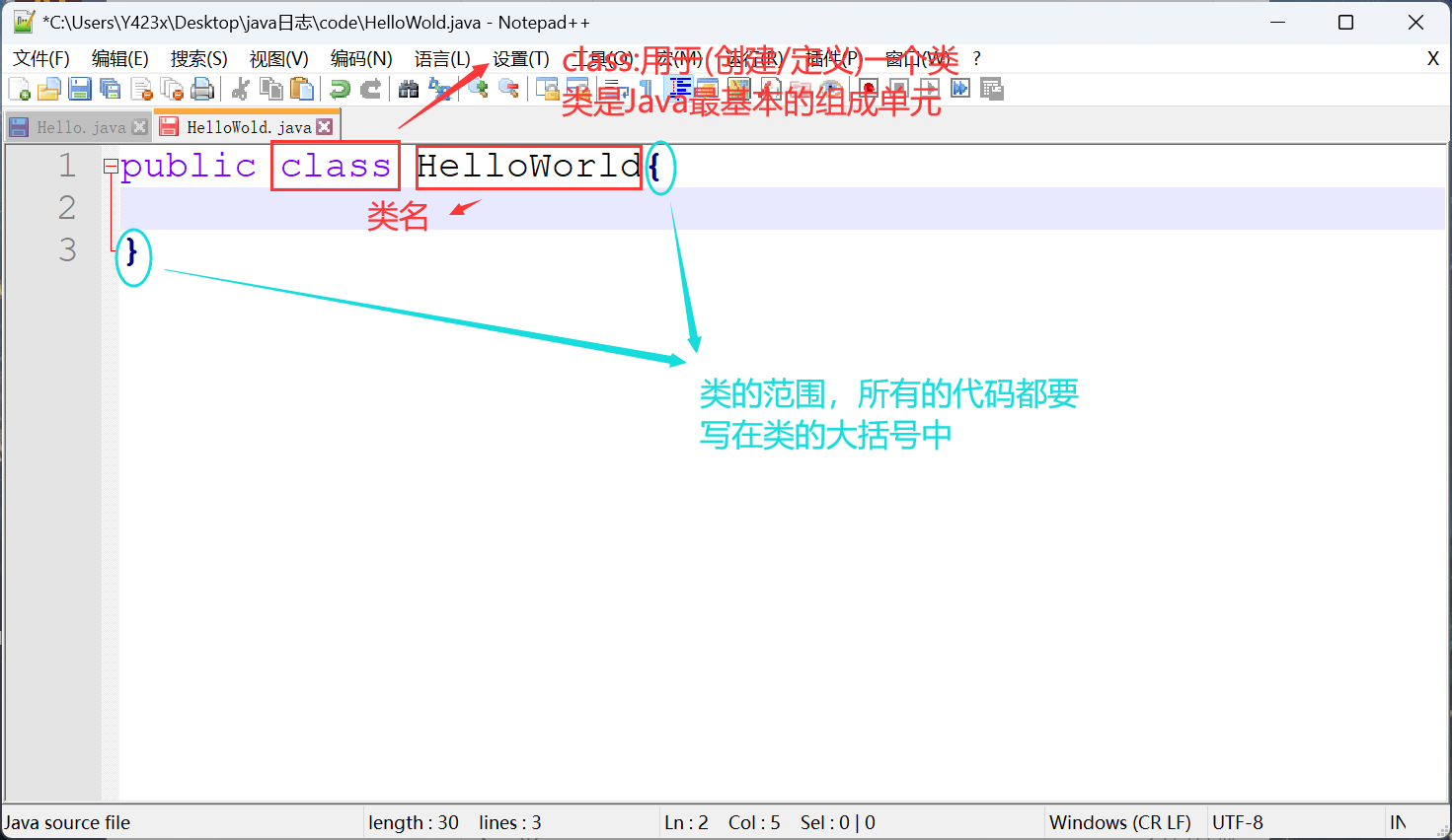 - class:用于(创建/定义)一个类;类是Java最基本的组成单元