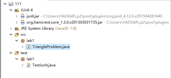 在src同级下创建一个test目录,在该目录下新建一个triangle包(此包名一定要和src中包名一致),在包中新建一个TestCase类用于编写测试用例。