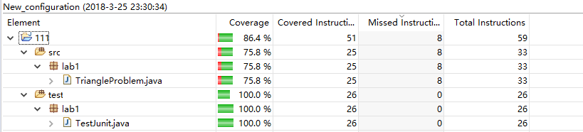 右键点击Triangle.java->Converage As->Converage Configurations(可对覆盖测试进行配置)->Converage结果如下: