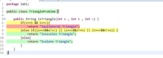 在代码中,eclemma通过不同的颜色来表示每行代码的执行情况:
