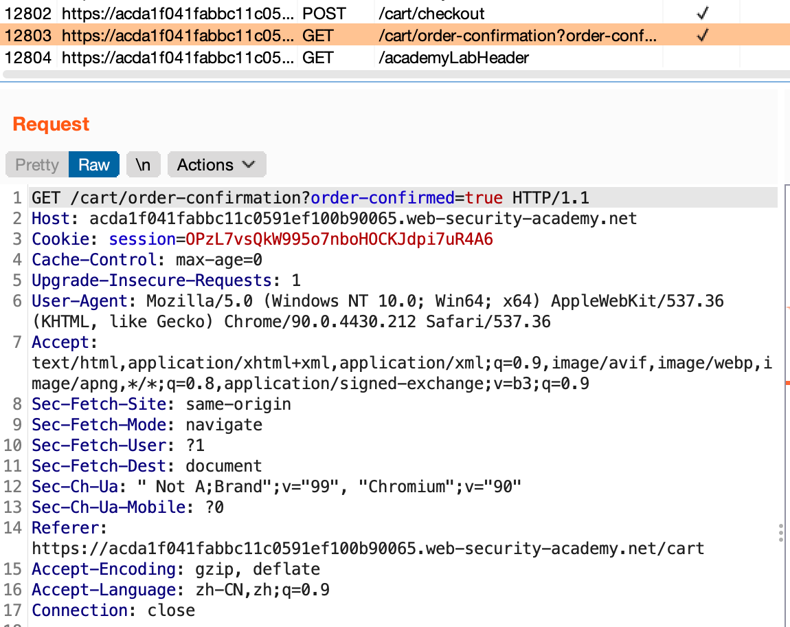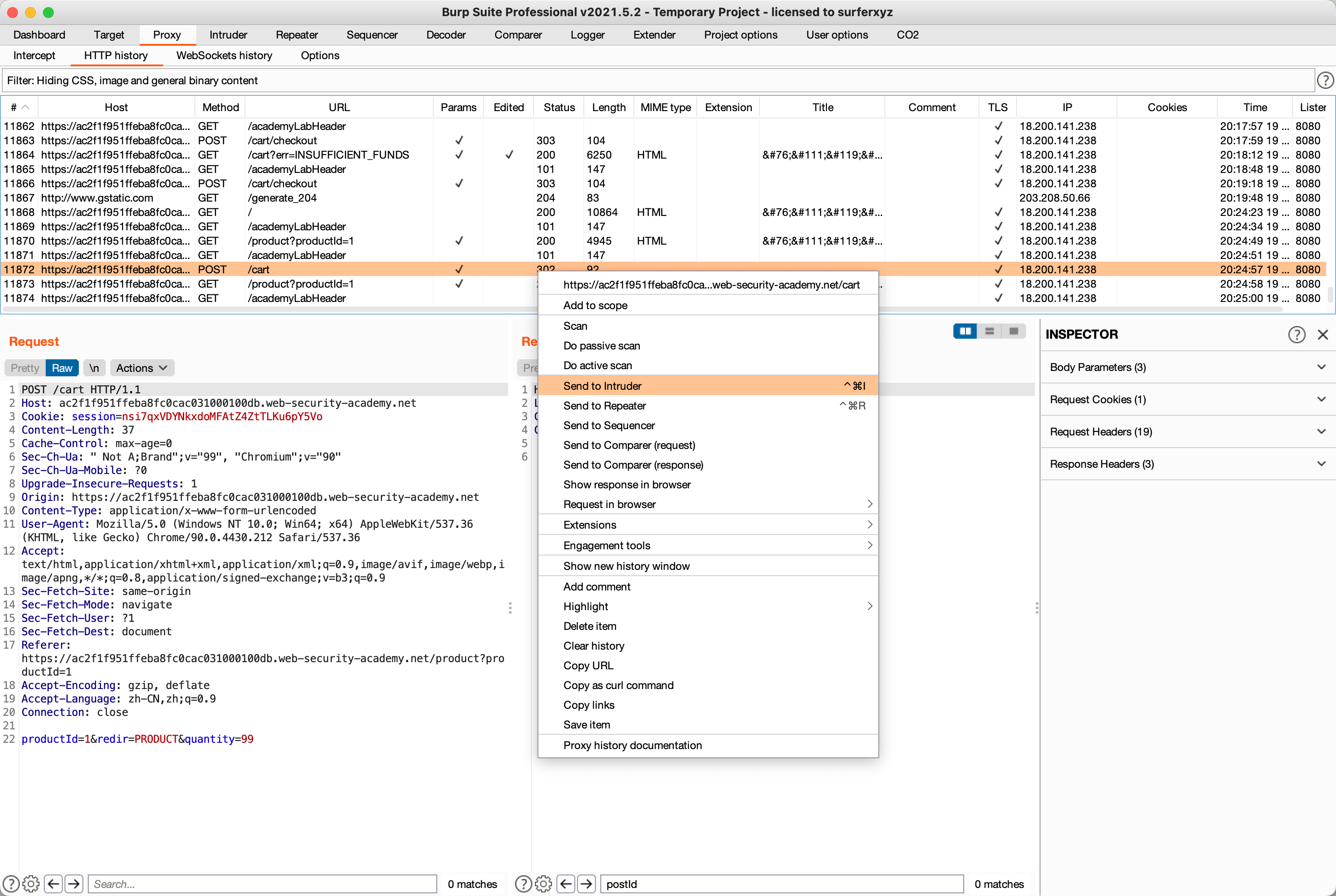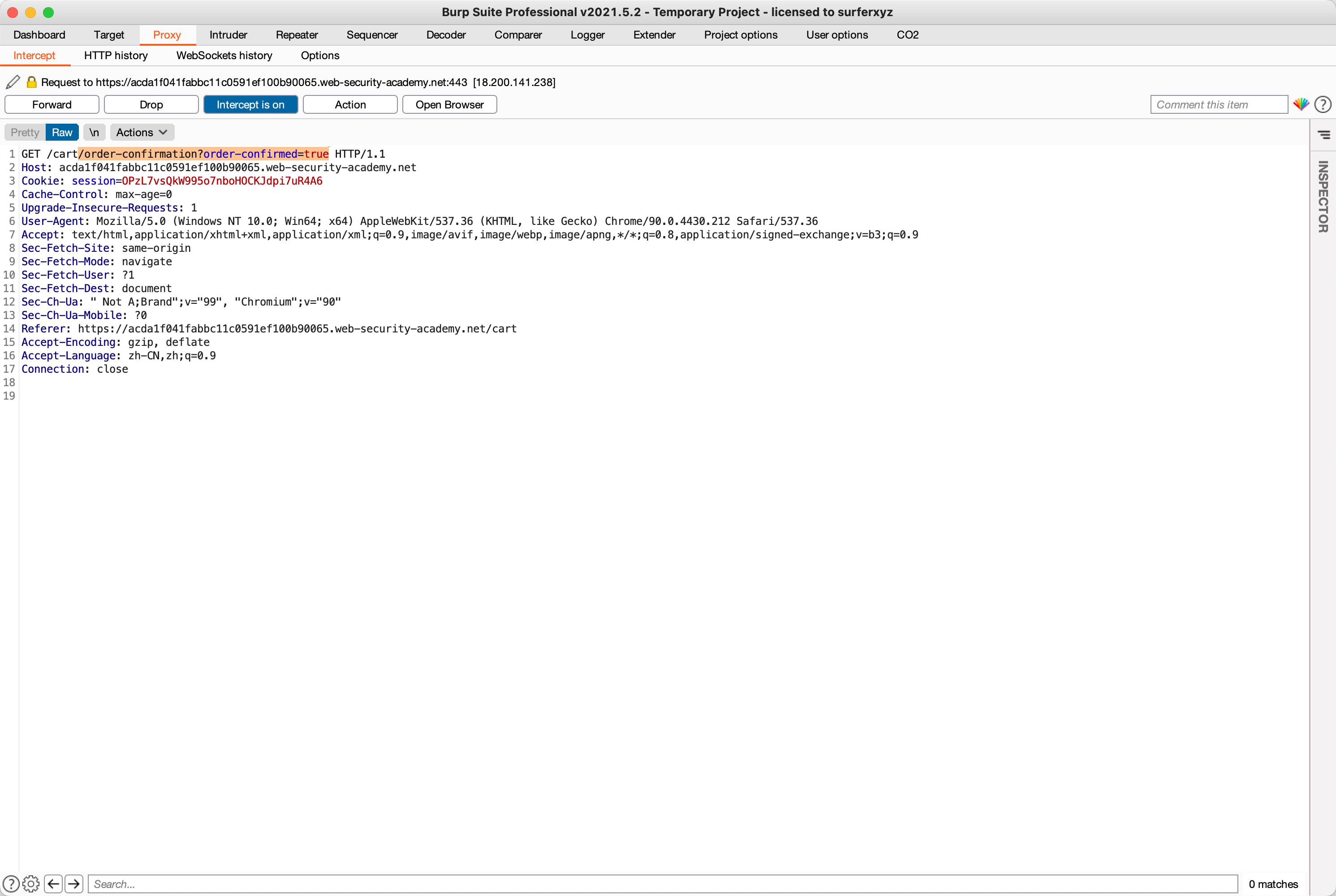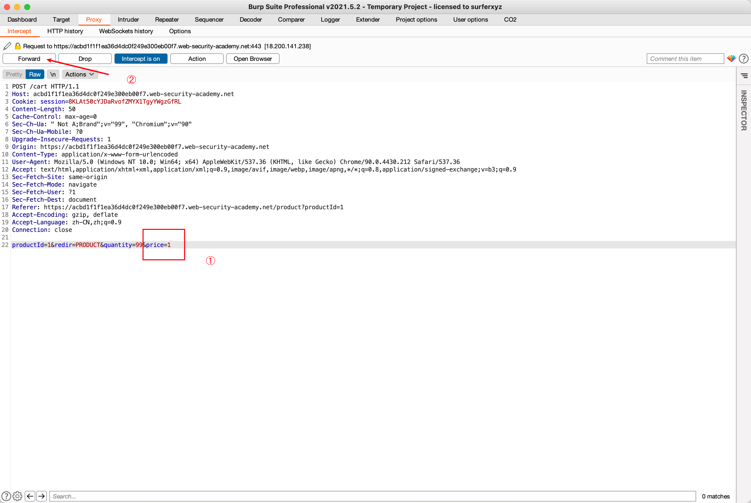 我们再把任务物品加入购物车,在买单前启动 burp 的拦截功能