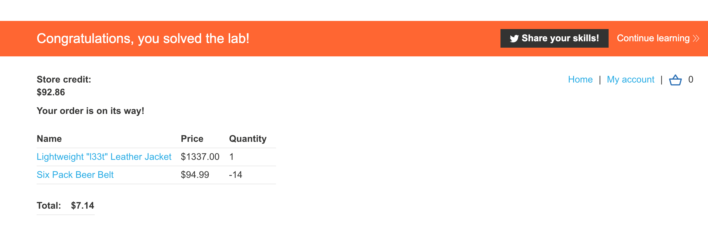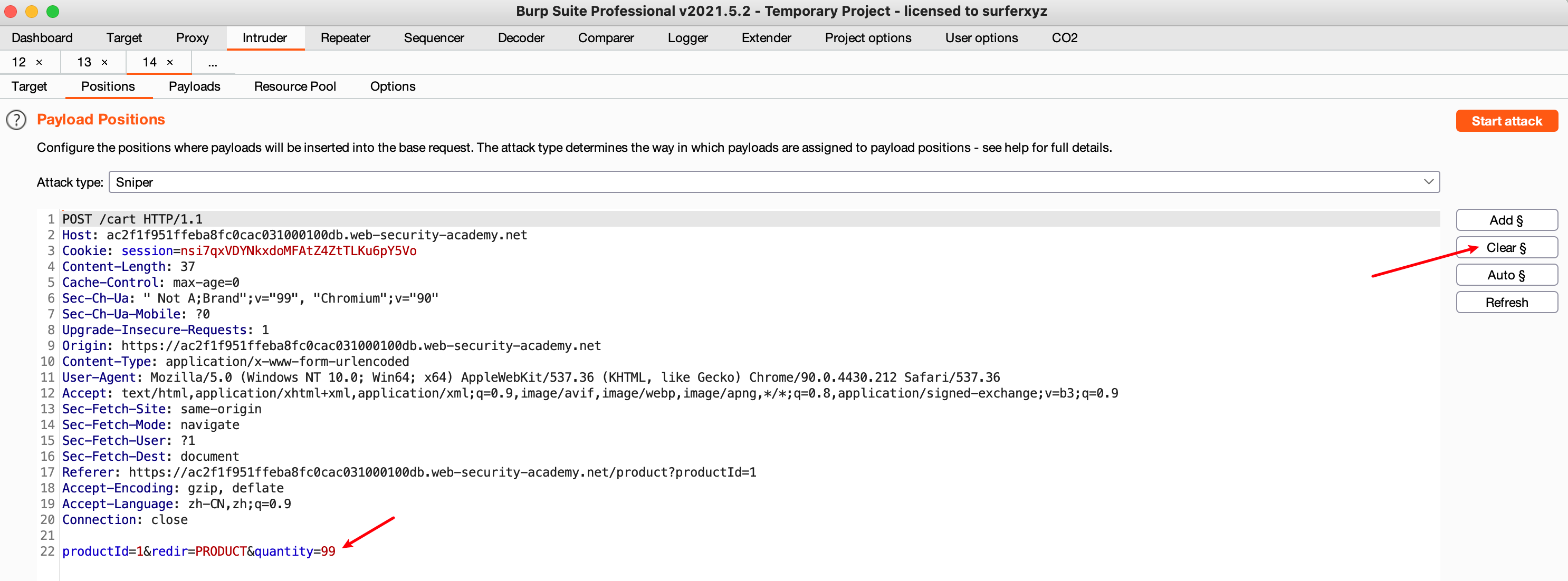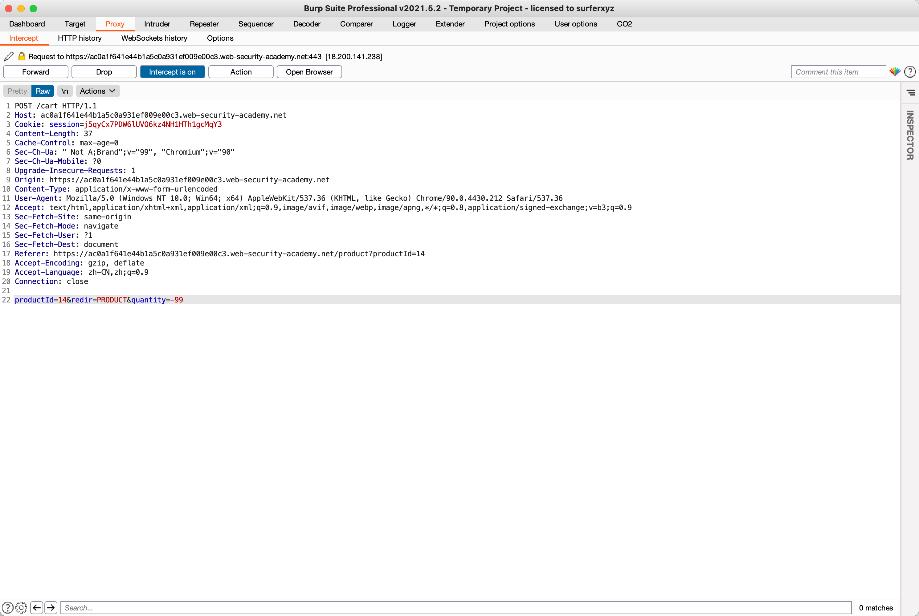 抓取 POST 包,修改 quantity 为 -99(实际上实验只需要-14)