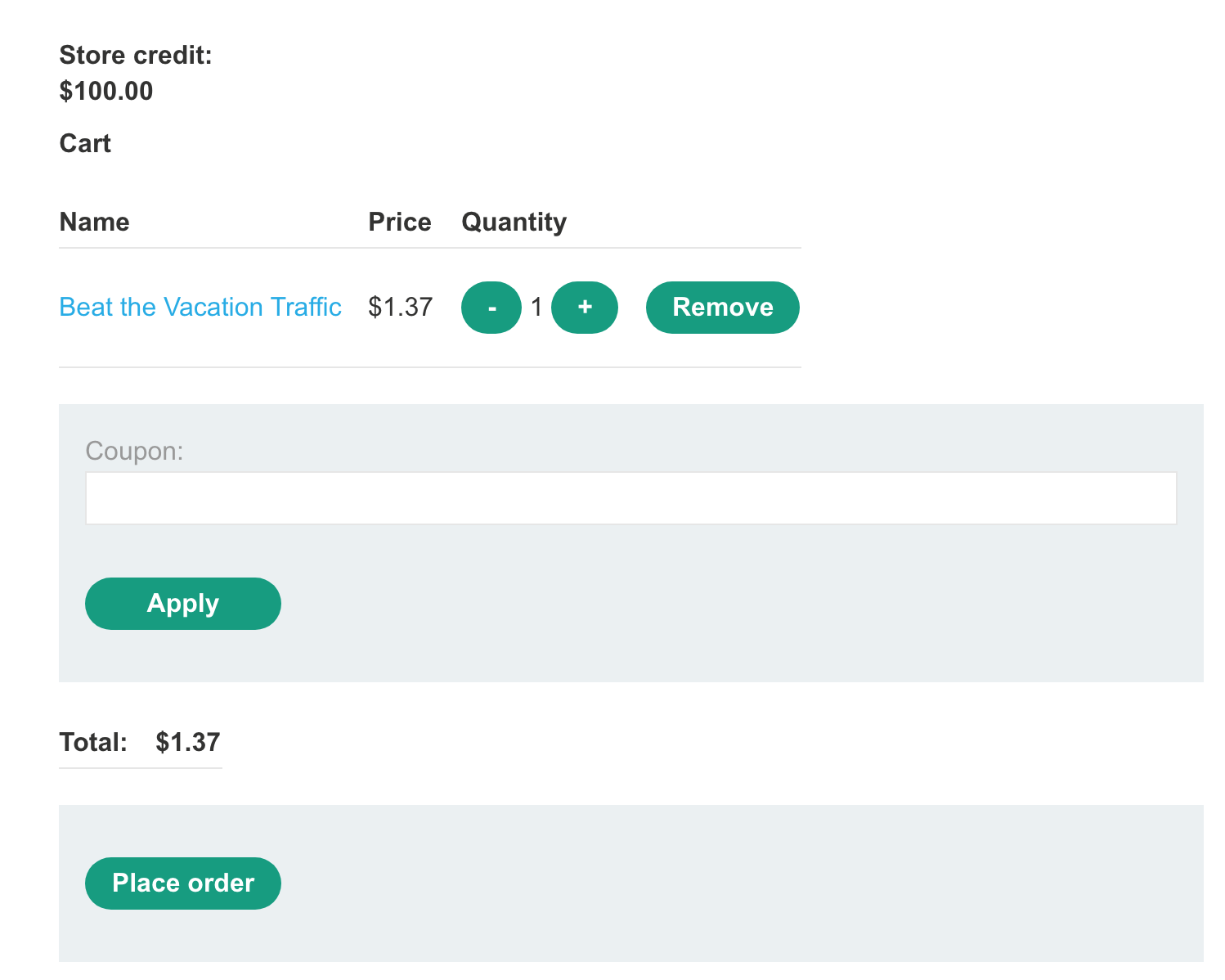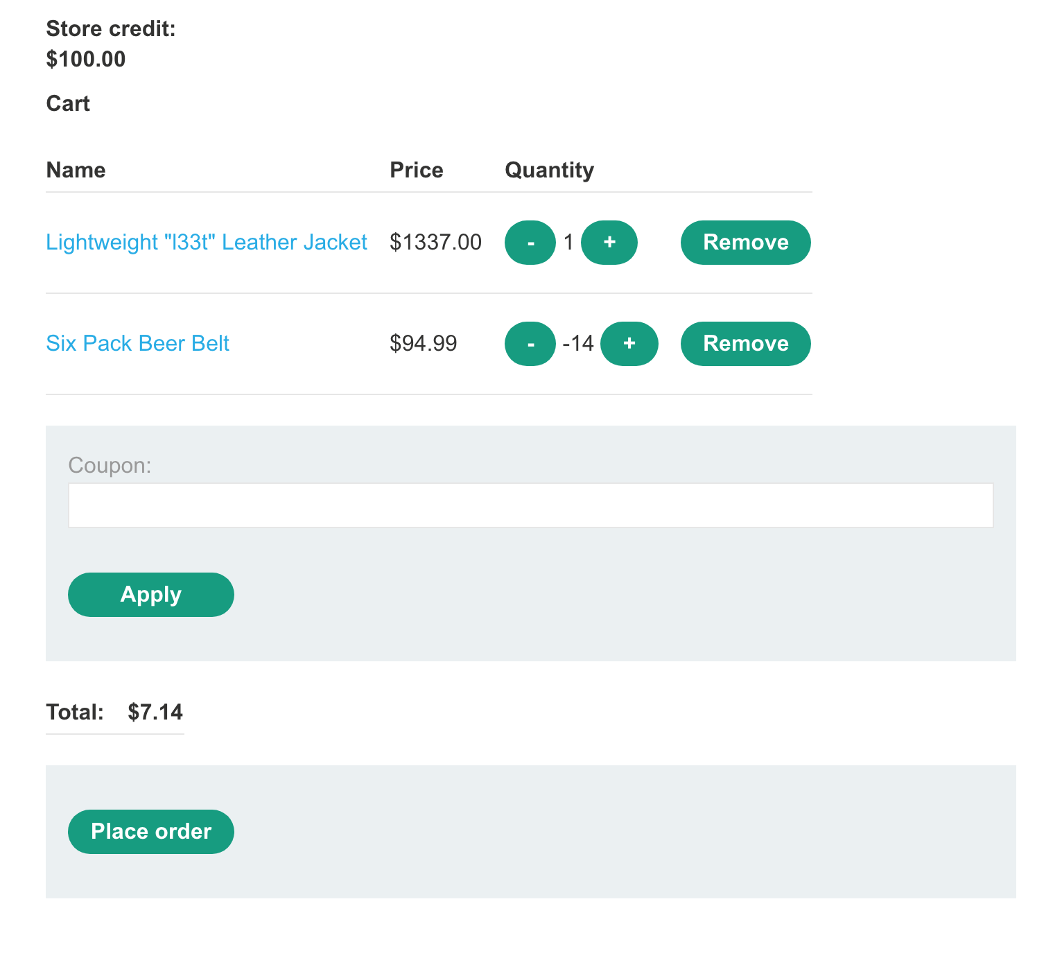 然后我们点击购物车,发现需要支付的金额是负数,我们不管,直接点击Place order结账,然后他显示结账金额应为正数,看来并不能倒贴我们钱
