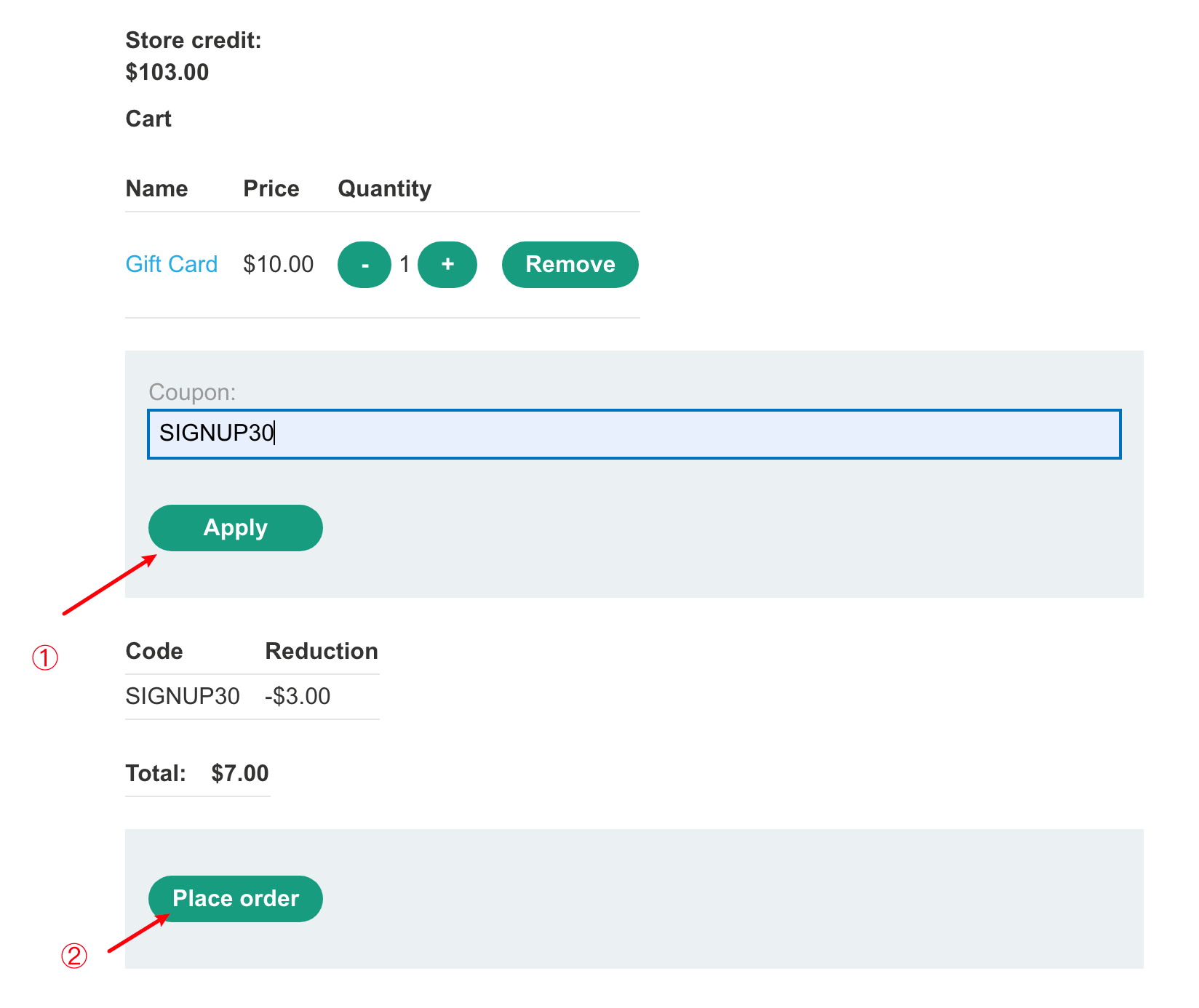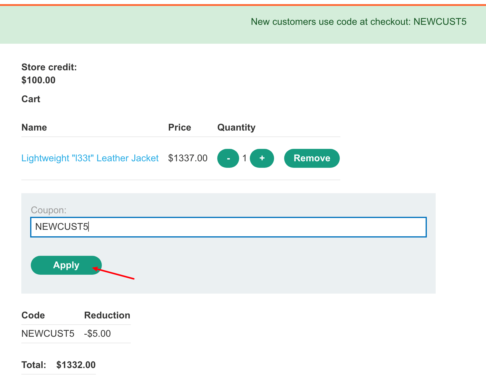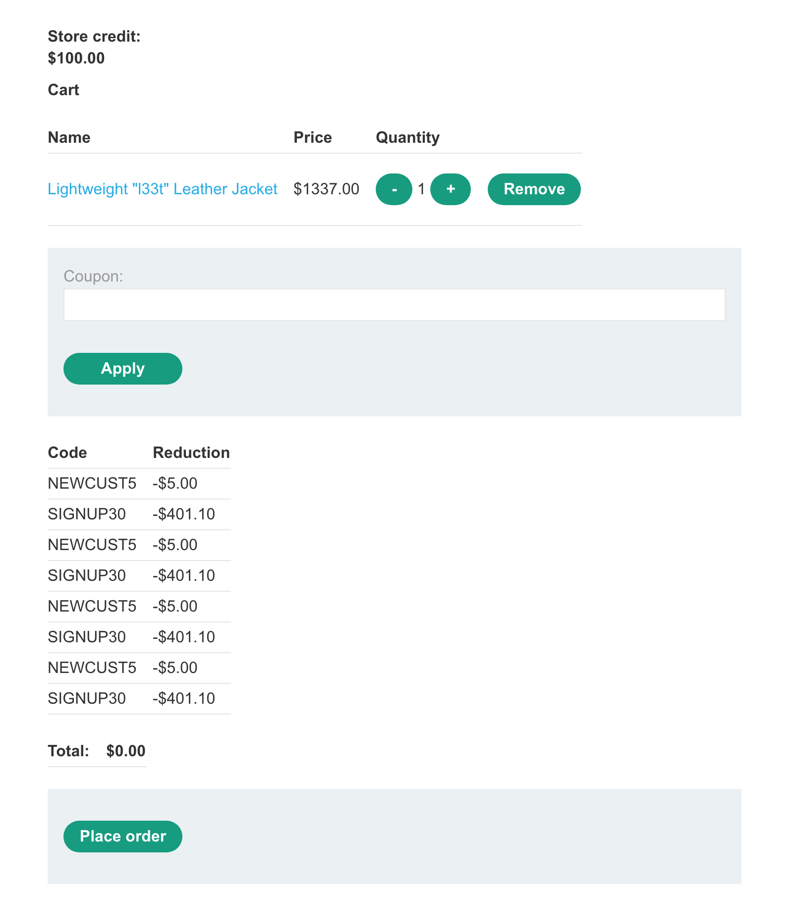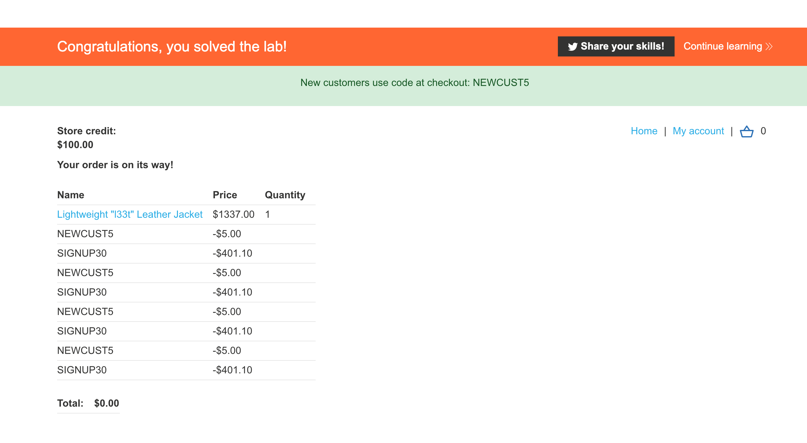 我们再试试刚刚的 NEWCUST5 优惠券,发现成功了,再试试 SIGNUP30,也成功,以此类推