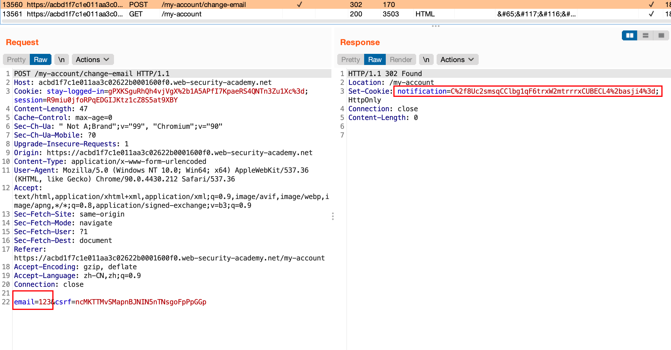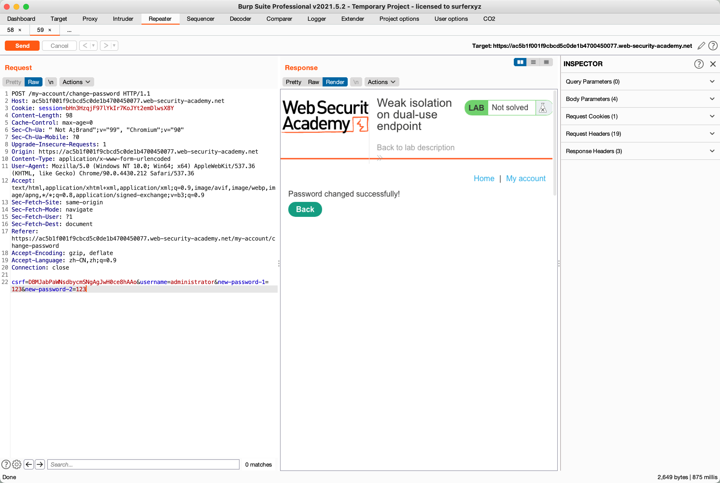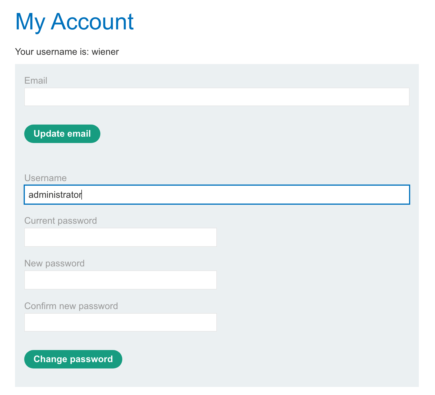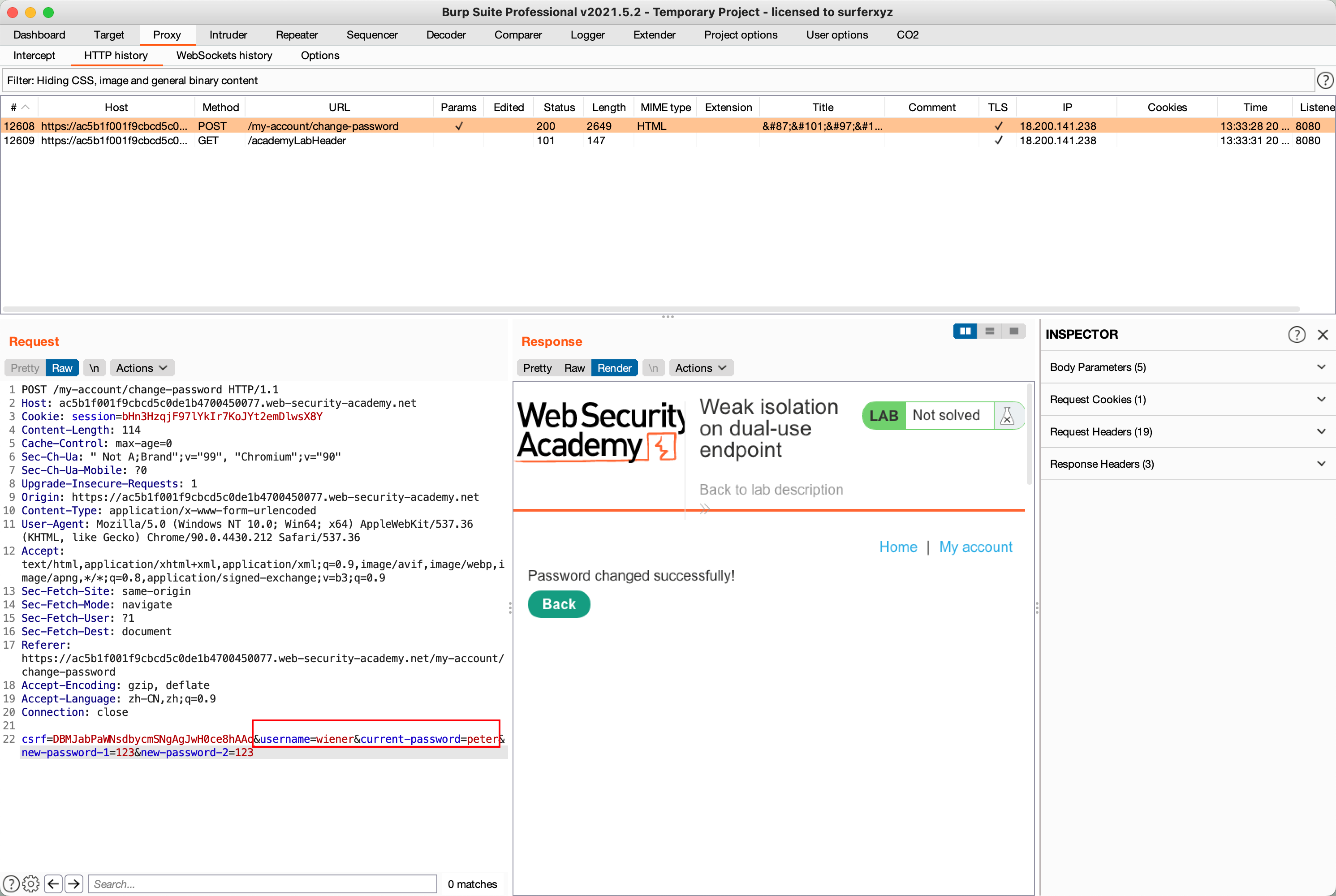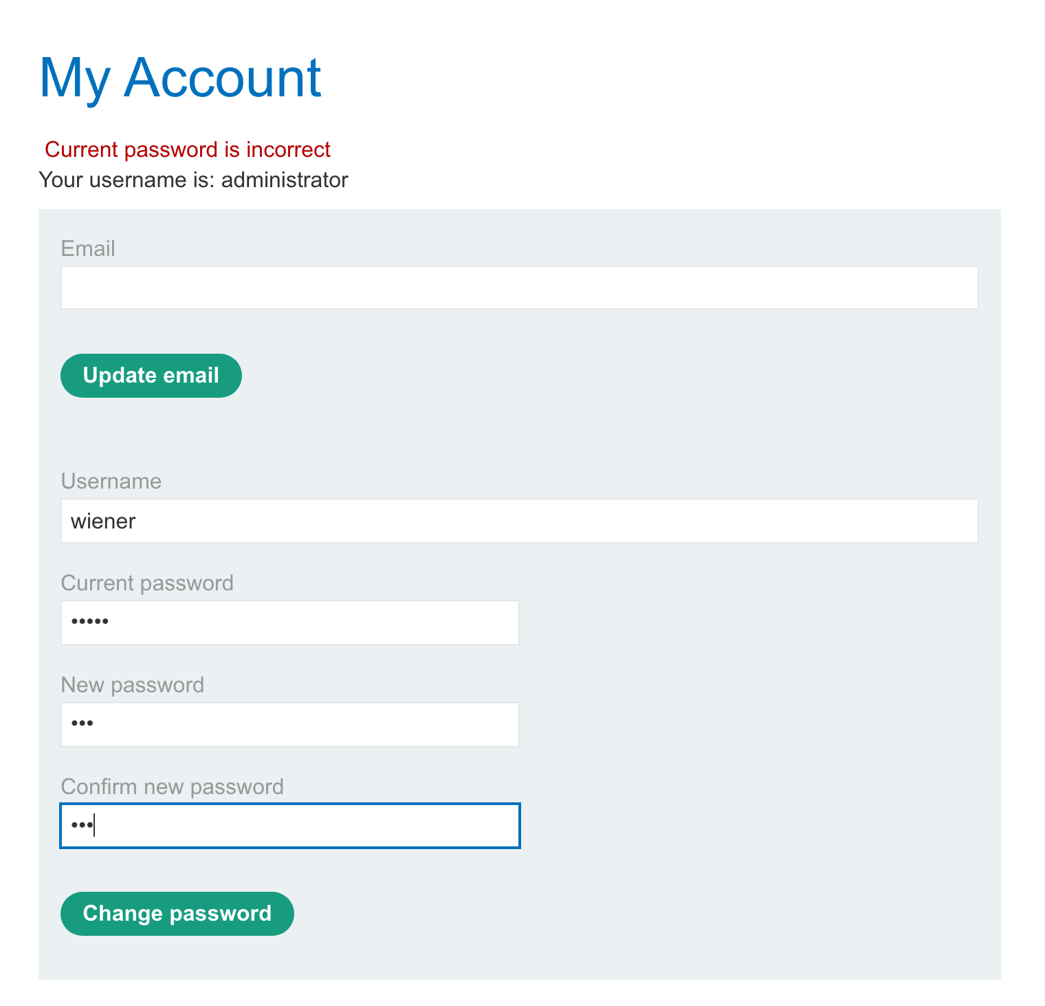 把该报发送到 Repeater,把用户改成 administrator 并删掉 current-password=peter 再发送