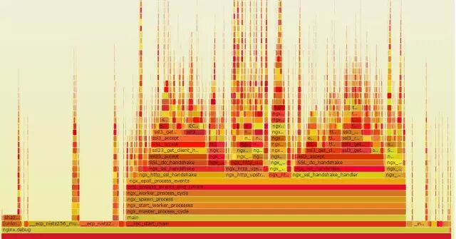 perf 有一个缺点就是不直观。火焰图就是为了解决这个问题。它能够以矢量图形化的方式显示事件热点及函数调用关系。比如我通过如下几条命令就能绘制出原生 nginx 在 ecdhe_rsa cipher suite 下的性能热点: