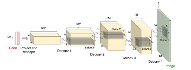 最近一个这样的模型是来自 Radford 等人的 DCGAN 网络(见下图)。该网络从一个高斯分布中选取 100 个随机数作为输入(我们将这些输入成为代码,或隐变量,用红色表示),然后输出一张图像(在这种情况下是右侧的 64x64x3 的图像,用绿色表示)。随着代码的逐步改变,生成的图像也在改变——这说明该模型已经学会了用来描述世界的模样的特征,而不仅仅是记得某些样本。