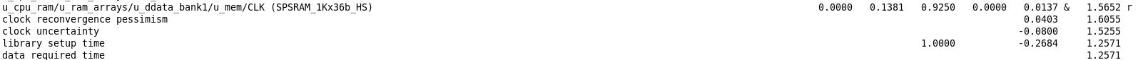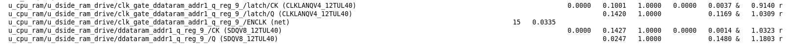 从图中可以看到时钟clk从source到第一个reg的CK端所用的时间是1.0323ns,时钟clk从source到SRAM的CLK端所用时间为(1.5652-0.625)/0.925=1.0164ns,由此可以计算出skew=1.0323-1.0164=0.0159ns,由此可见tree基本是平的。