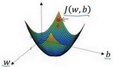 代价函数(成本函数)J(w, b)是在水平轴w和b上的曲面,因此曲面的高度就是J(w, b)在某一点的函数值。我们所做的就是找到使得代价函数(成本函数)J(w, b)函数值是最小值,对应的参数w和b。