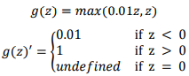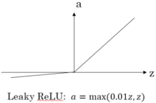 另一个版本的 Relu 被称为 Leaky Relu,当z是负值时,这个函数的值不是等于 0,而是轻微的倾斜,这个函数通常比 Relu 激活函数效果要好,尽管在实际中 Leaky ReLu 使用的并不多,如图: