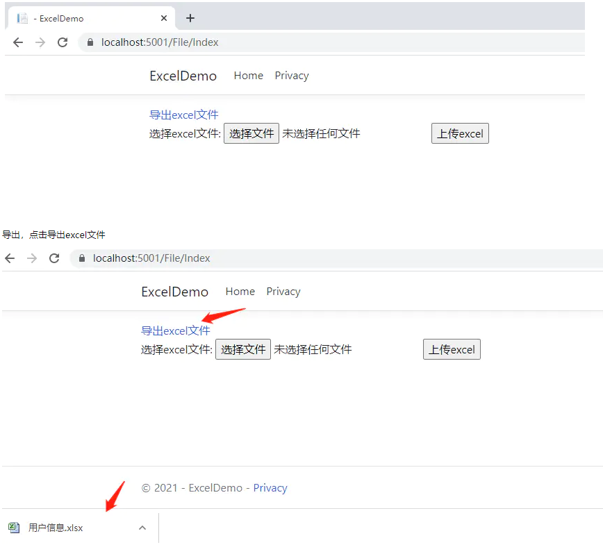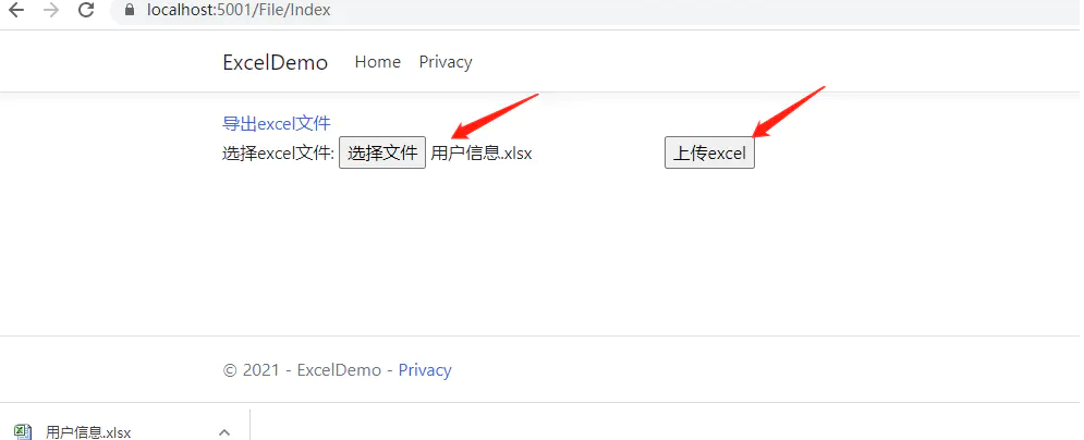 @{ } <a href="/File/DownLoad">导出excel文件</a> <form action="/File/Upload" method="post" enctype="multipart/form-data" > 选择excel文件: <input type="file" name="file" /> <input type="submit" value="上传excel" /> </form>