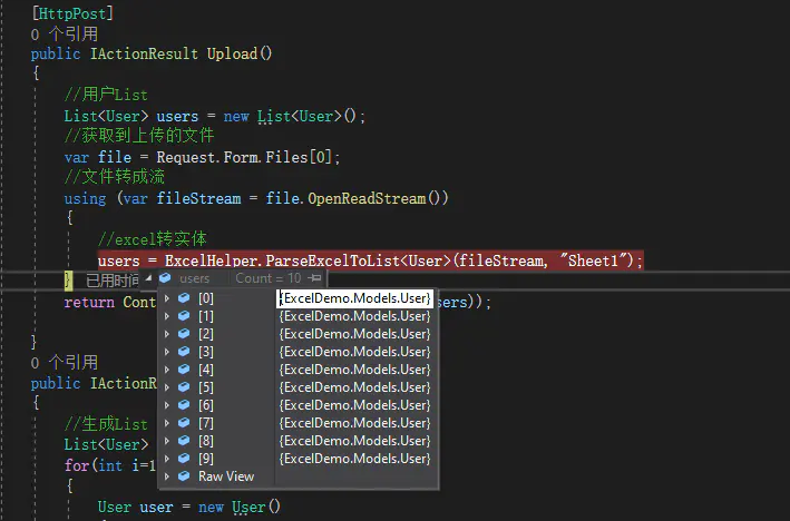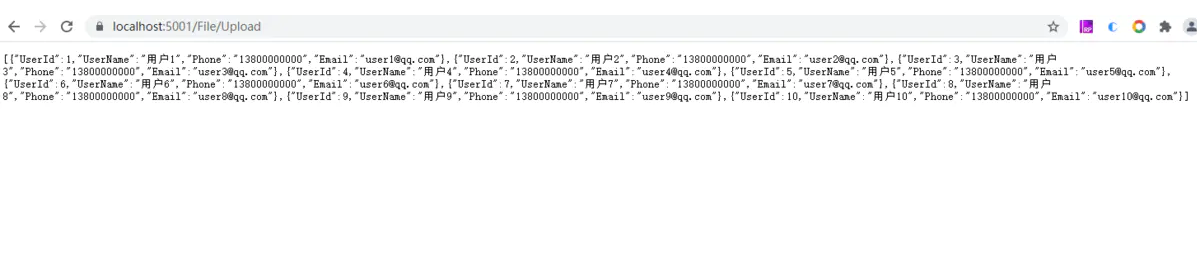 public class FileController : Controller { public IActionResult Index() { return View(); } [HttpPost] public IActionResult Upload() { //用户List List<User> users = new List<User>(); //获取到上传的文件 var file = Request.Form.Files[0]; //文件转成流 using (var fileStream = file.OpenReadStream()) { //excel转实体 users = ExcelHelper.ParseExcelToList<User>(fileStream, "Sheet1"); } return Content(JsonConvert.SerializeObject(users)); } public IActionResult DownLoad() { //生成List List<User> usrs = new List<User>(); for(int i=1;i<=10;i++) { User user = new User() { UserId = i, UserName = "用户" + i, Phone = "13800000000", Email = $"user{i}@qq.com" }; usrs.Add(user); } //List转为Excel文件 var fileStream = ExcelHelper.ParseListToExcel(usrs); return File(fileStream.ToArray(), "application/vnd.ms-excel", "用户信息.xlsx"); } }