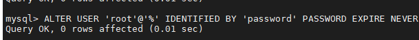 ALTER USER 'root'@'%' IDENTIFIED BY 'password' PASSWORD EXPIRE NEVER;