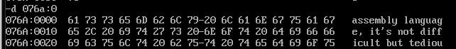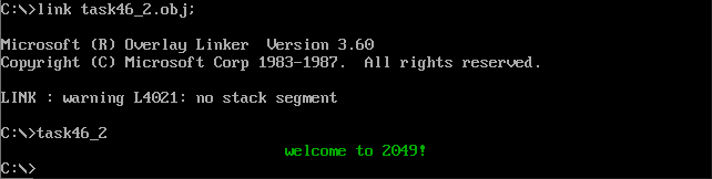 assume cs:code code segment start: ; 42 interrupt routine install code mov ax, cs mov ds, ax mov si, offset int42 ; set ds:si mov ax, 0 mov es, ax mov di, 200h ; set es:di mov cx, offset int42_end - offset int42 cld rep movsb ; set IVT(Interrupt Vector Table) mov ax, 0 mov es, ax mov word ptr es:[42*4], 200h mov word ptr es:[42*4+2], 0 mov ah, 4ch int 21h int42: jmp short int42_start str db "welcome to 2049!" len equ $ - str ; display string "welcome to 2049!" int42_start: mov ax, cs mov ds, ax mov si, 202h mov ax, 0b800h mov es, ax mov di, 24*160 + 32*2 mov cx, len s: mov al, [si] mov es:[di], al mov byte ptr es:[di+1], 2 inc si add di, 2 loop s iret int42_end: nop code ends end start