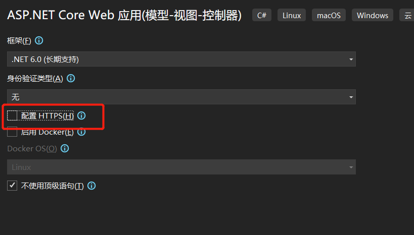 第三步:在这里我们 取消勾选 配置HTTPS(H) 选项,随后点击 “创建” 按钮,到此MVC项目创建就全部结束了