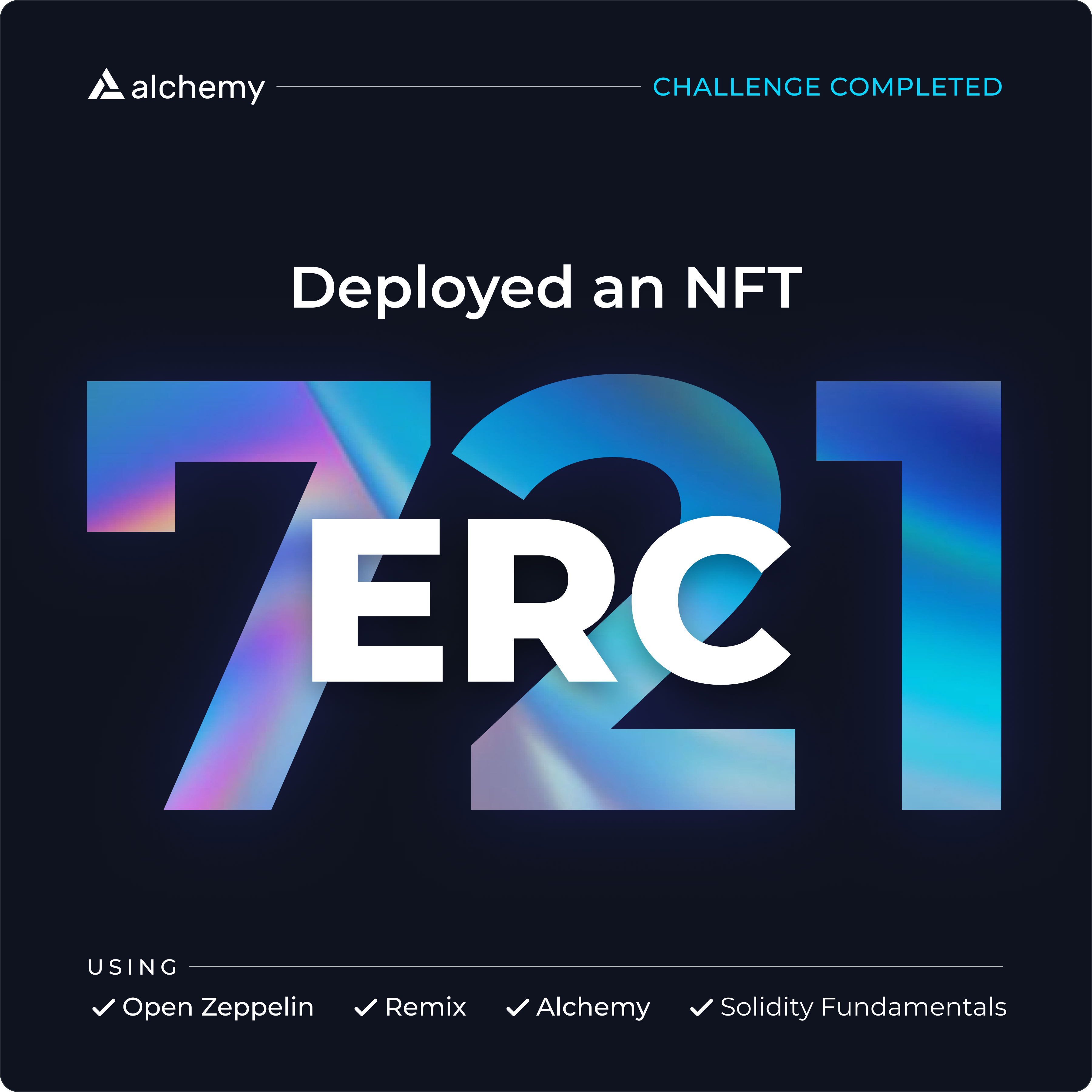 "description": "This NFT proves I've created and deployed my first ERC20 smart contract on Rinkeby with Alchemy Road to Web3",