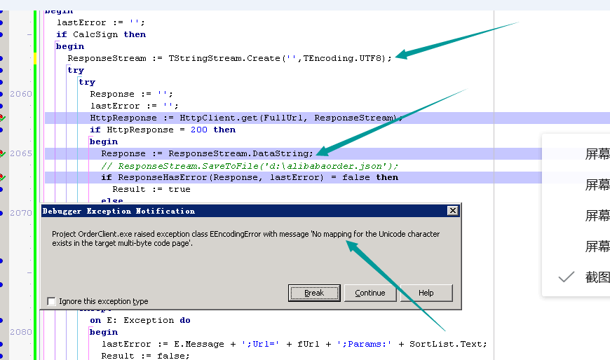 问题现象为:返回值中的数据,部分为UTF8编码,部分不是的情况,使用TEncoding.UTF8格式接收返回值,会报错"No mapping for the Unicode..."
