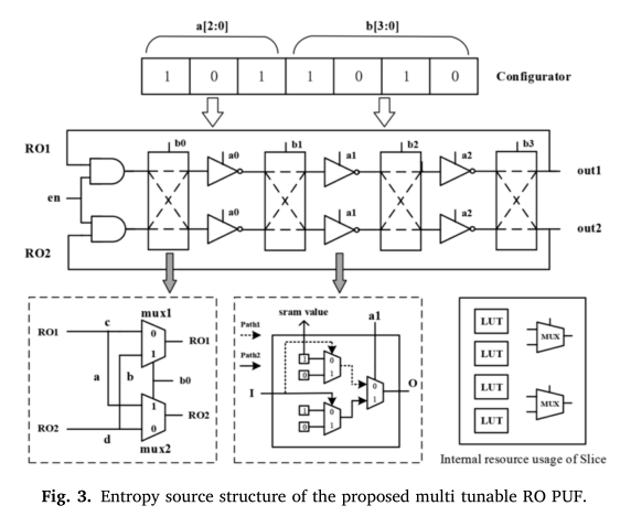 (1)我们设计了一个多可调RO结构。它可以同时改变振荡信号的传输路径和各逆变器的内部延迟。使用更少的硬件开销可以最大限度地提高延迟复杂性,以生成更多的身份验证密钥。