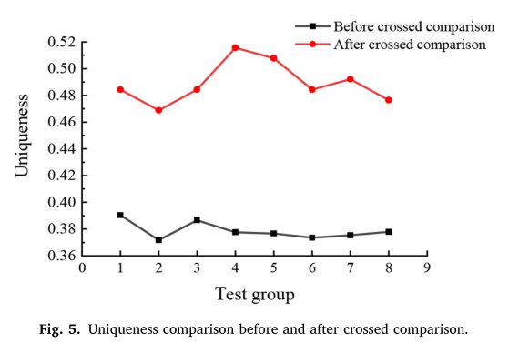 该体系结构中的逆变器和路径选择器分别由Slice中的LUT和MUX资源来实现,从而达到在FPGA中使用尽可能少的可编程逻辑单元的目的。与传统的RO PUF相比,它不占用更多的切片。然而,由于Slice的结构特点,当我们在同一Slice中实现逆变器和路径选择结构时,RO中的交叉传输路径无法实现高对称性。因此,它会影响PUF的性能,特别是响应的唯一性。我们的解决方案是改变传统的RO振荡频率比较方式,采用交叉比较的方案。另外引入一组复制的RO结构,如图4所示。采取了两个步骤。首先,我们通过布局设置将RO1和RO3中的端口和组件设置在对称位置。其次,采用交叉比较方案,使更对称的RO1和RO3比较振荡信号的计数值,并比较RO2和RO4振荡信号的计数值。这样可以在很大程度上改善结构对称性,减小系统偏差。此外,在该体系结构中,通过输入不同的配置信号可以生成128位的响应数据。图5为采用交叉比较方案前后的八组唯一性比较数据。采用离散比较的方法可以有效地提高PUF的唯一性。