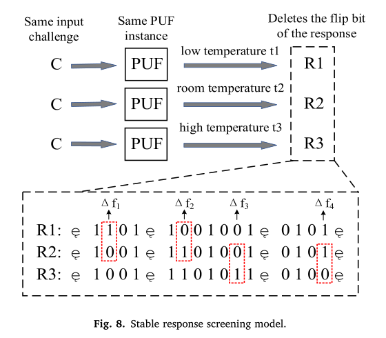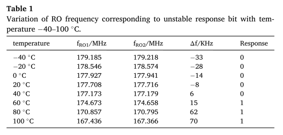 PUF提取芯片在制造过程中的工艺偏差,生成唯一的认证密钥。但是,过程偏差引起的设备延迟偏差非常小,设备在认证过程中的外部环境是不可预测的。因此,可变的环境因素很可能对提取小延迟偏差产生负面影响。RO PUF在工作过程中,外部温度和电压的波动可能会导致RO频差极性翻转,从而带来比特误差。表1显示了在−20-100◦C检测到的一个比特的不稳定响应对应的两个ROs的振荡频率。从表中可以看出,随着温度的增加,振荡频率的RO呈现出下降的趋势,和RO2较高,对环境的敏感性和频率下降幅度较大,所以当温度在40~60◦C,响应比特翻转。温度越高,频率差越大。第2节还分析了RO频率差异越大,对环境影响的容忍度越高。许多提高稳定性的puf采用文献[26]中的方法。通过RO的不同配置,提取出频率差最大的相对稳定响应。但这种方法有两个缺点。部分稳定性高的响应可能被放弃,造成一定程度的资源浪费。而且,所选择的最大频率差是相对的,并不一定能够忍受环境的变化。因此,为了解决这些问题,我们需要准确设置频差阈值,在不造成硬件资源浪费的前提下,选择频差较大且满足阈值条件的响应。