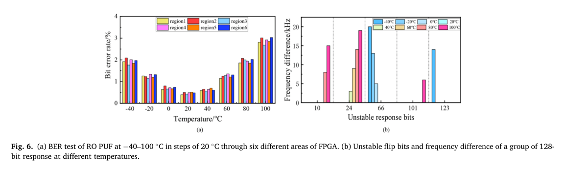为了更准确地设定阈值,我们研究了温度对RO PUF响应翻转的影响。图6a)显示了RO PUF在−20 - 100◦C步骤20通过FPGA的6个不同区域的误码率(BER)测试。图6b)显示了一组128位响应在不同温度下的不稳定翻转位和频率差。