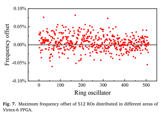 图7为Virtex-6 FPGA板上512个ROs在不同区域的最大频率偏移量。通过对测量结果的统计分析,在相同的环境条件下,RO的最大振荡频率波动不会超过0.1%。