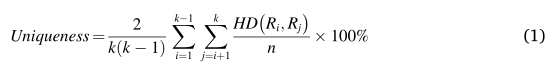 唯一性是指将同一组挑战输入到不同的PUF芯片中得到的响应的差异,也称为片间差异。一般来说,当对两个芯片施加相同的激励时,响应结果应该是不同的。唯一性通常通过计算同一类型PUF不同输出响应之间的汉明距离来测量,理想值为50%。若Ri和Rj分别为第i和第j个PUF芯片的n位响应序列,则唯一性可由式(1)计算: