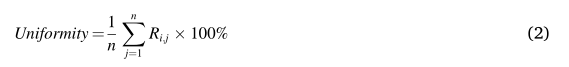 均匀性用于评估0和1在PUF响应中的分布。理想情况下,PUF响应的每一位输出0或1的概率应该是相等的。因此,均匀度越接近50%的理想值,PUF的随机性越好。均匀性由公式(2)计算,其中Ri,j为第i个芯片的n位响应的第j位。
