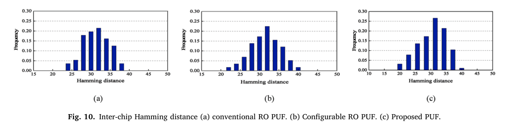 其中k为待测试芯片数,HD (Ri,Rj)为相同挑战下芯片i和芯片j响应的汉明距离。为了比较其唯一性,我们测试了常规RO PUF、可配置RO PUF[26]和我们提出的RO PUF的片间汉明距离,如图10所示。分布定性为高斯分布,PUF芯片间的平均汉明距离分别为48.26%、48.87%和49.17%。这证明了所提出的PUF设计具有更好的唯一性。