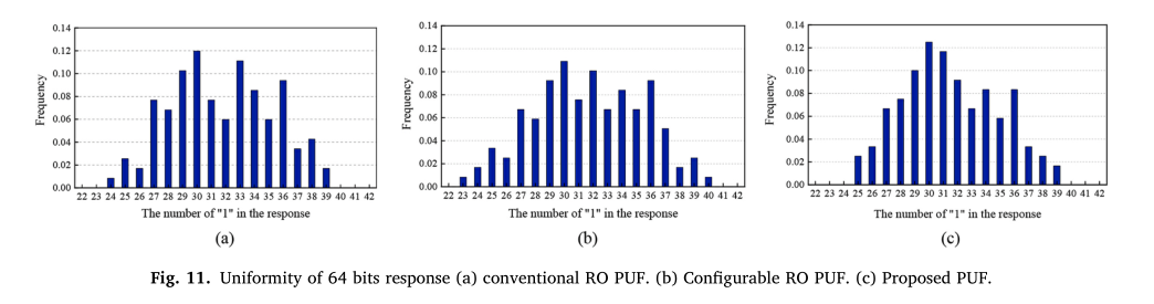 为了准确测试不同PUF电路输出响应的均匀性,我们从三个不同PUF中提取1024组64位响应数据进行统计计算。试验结果如图11所示。对于我们提出的PUF,在64位输出响应中,1的最大位数是39,1的最小位数是25。最终均匀度结果为49.52%,非常接近50%的理想值。常规RO PUF和可配置RO PUF的均匀度分别为48.92%和48.23%。实验结果表明,该方法具有良好的均匀性。