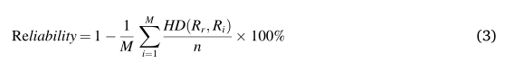 可靠性对于PUF来说尤为重要,它决定了设备认证的成功与否。理想情况下,PUF对相同输入挑战的响应应该在重复测试中保持相同。在不同环境下的重复实验中,PUF在同一挑战下产生的任何两种反应之间的差异也应该很小。在M种不同的环境下,PUF电路的可靠性可以通过公式(3)来测量。