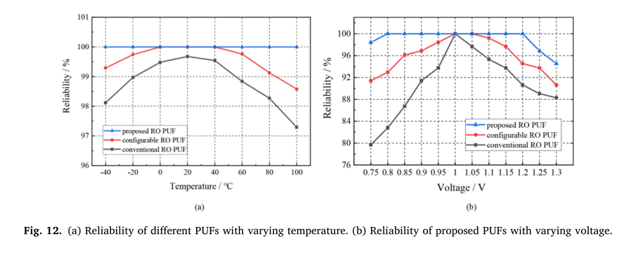在设备认证过程中,密钥中只有一个bit的错误就会导致认证失败,严重影响硬件设备的安全。因此,可靠性是PUF的重要性能。设备认证的外部环境可能是多种多样的,所以我们需要一种能够在不同环境下保持高可靠性的PUF电路。
