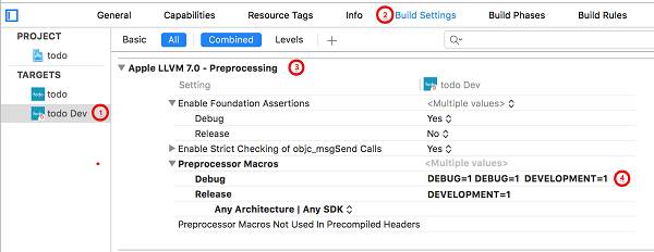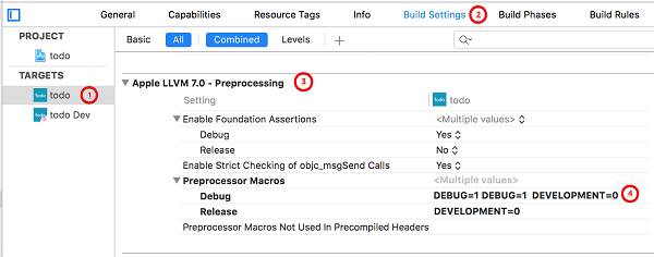 对于Objective-C的项目,去到`Build Settings`下`Apple LLVM 7.0 - Preprocessing`。拓展`Preprocessor Macros`在Rebug和Release区域添加一个变量。对于开发target(即todo Dev),将该值设置为`DEVELOPMENT = 1`。另一个,将值设为`DEVELOPMENT=0`来表示生产版本。