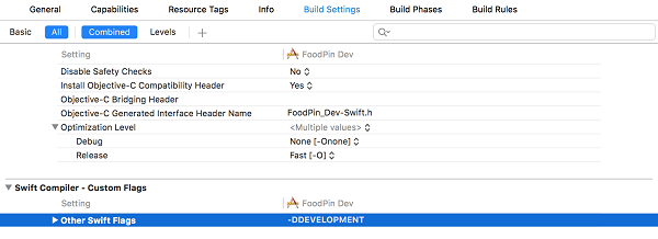 对于swift的项目,编译器不再支持预处理指令。作为替代,它使用编译时的属性和build配置。选中开发target,添加一个标识表示开发版本。找到`Build Setting`往下滚动到`Swift Compiler - Custom Flags`部分。将值设为`-DDEVELOPMENT`表示这个target作为开发版本。