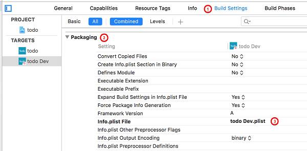 7. 现在打开你开发target的“Build Settings”,滚动到“Packaging”,并将值改为开发的plist文件(todo Dev.plist)。