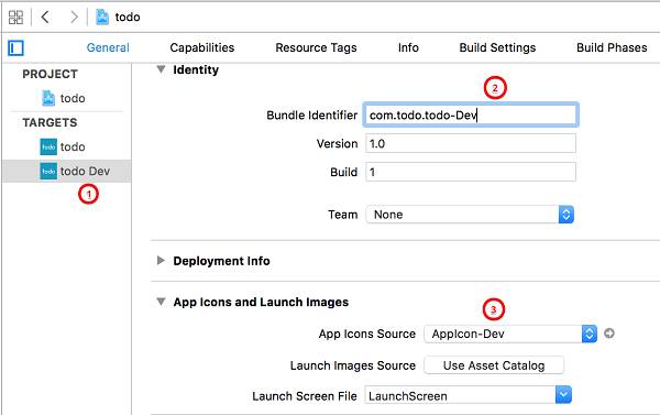 5.现在回到项目设置,选择您的开发target,并改变Bundle Identifier。你可以简单地将“Dev”追加到原来的ID上。如果执行了步骤4,请确保更改应用app icon,设置为在上一步中创建的。