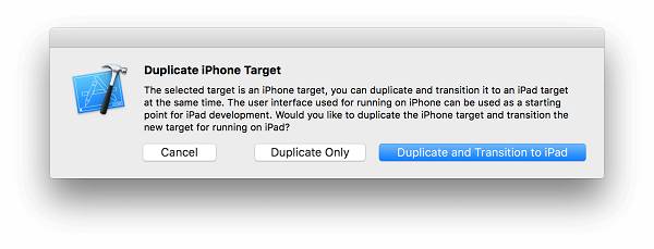 2.Xcode会询问你新的target是否是为iPad开发。对于本教程,我们只是选择“Duplicate Only”。