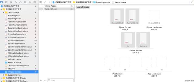 2.找到工程中的Images.xcassets文件,打开LaunchImage,将图片拖到对应的地方,如下图: