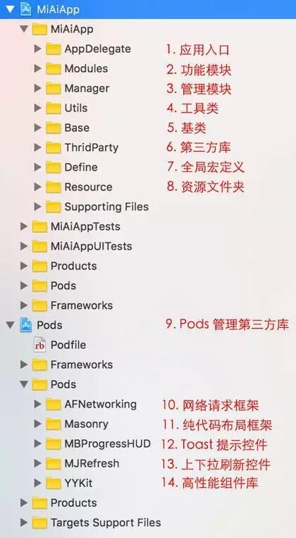如上图,我是这样搭建App目录结构的,从下到上,使用Pods管理第三方框架,将第三方框架进行二次封装,供给顶层使用,尽可能减少各模块之间的耦合度,只为更清晰。