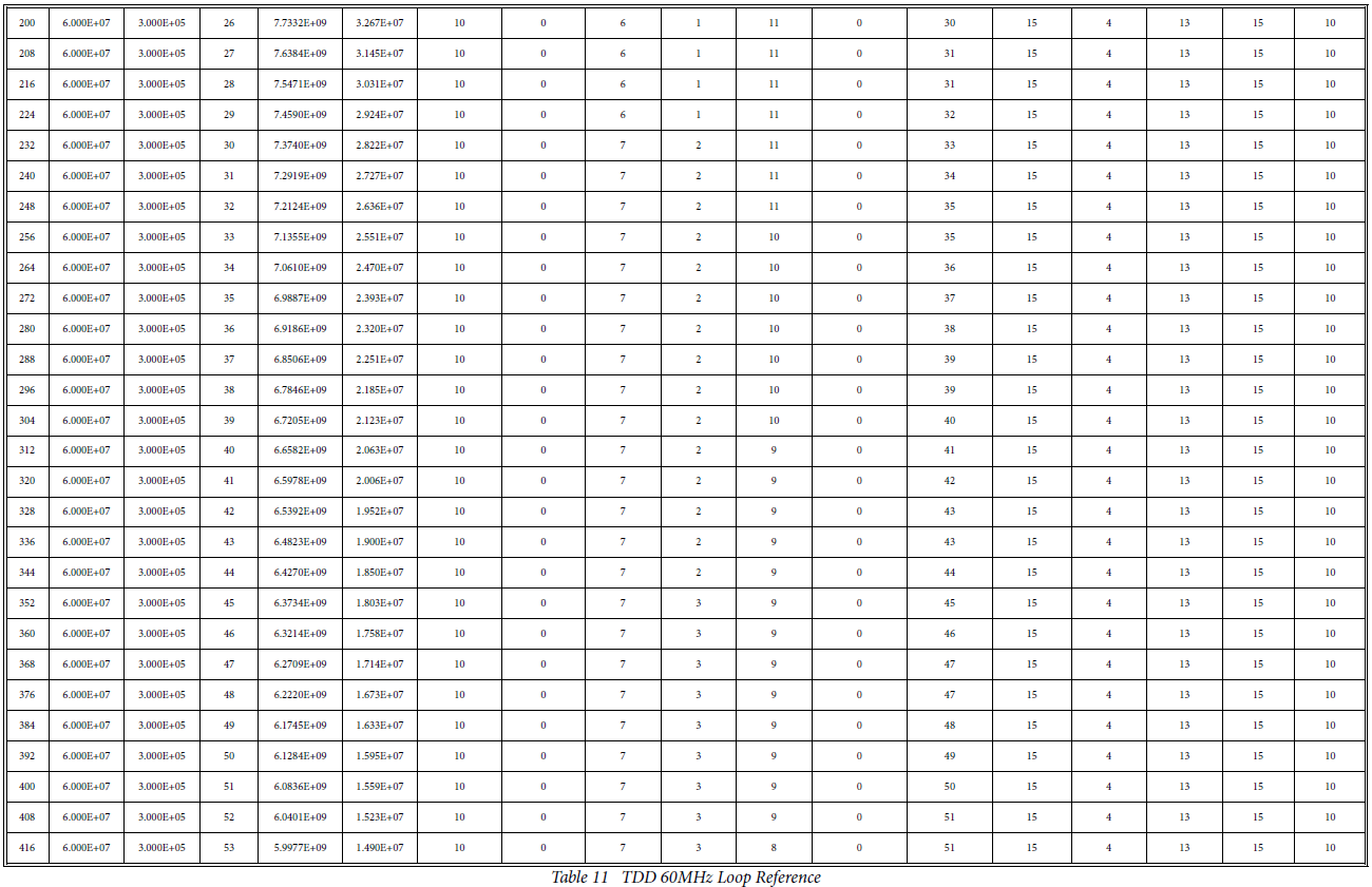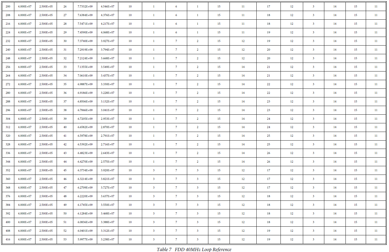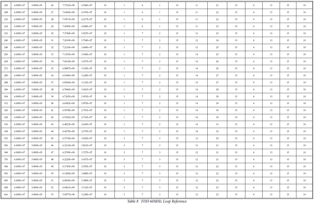 [1] 根据工作模式(TDD/FDD)和鉴相器(即电荷泵)参考频率,从6个表中选择一个。