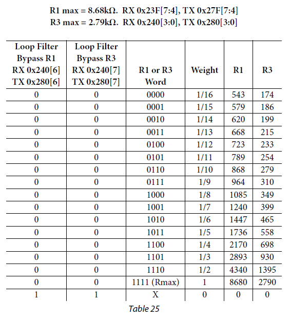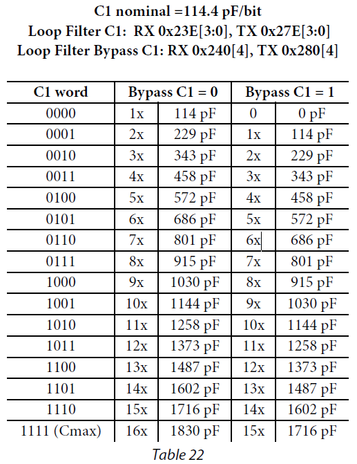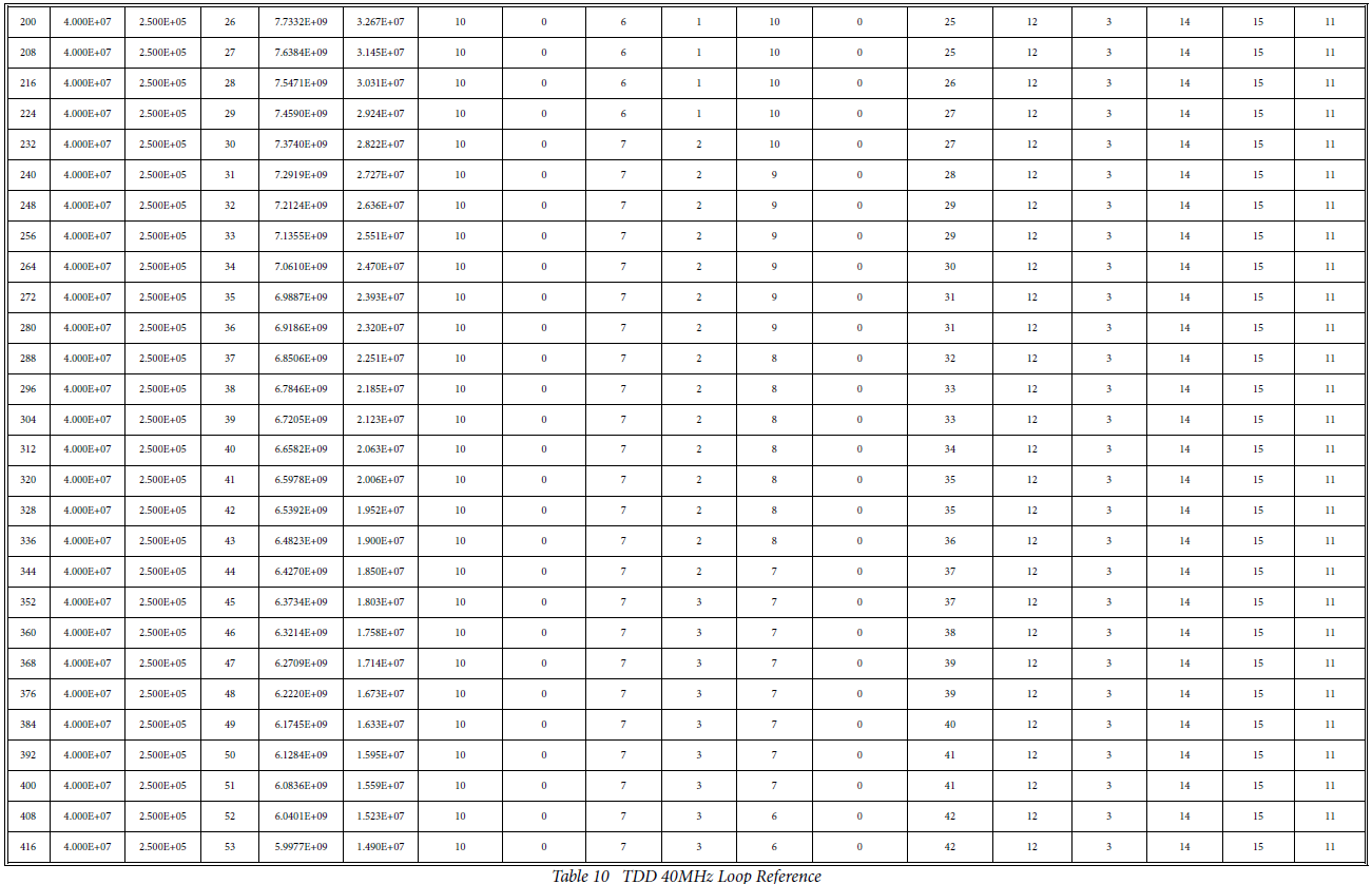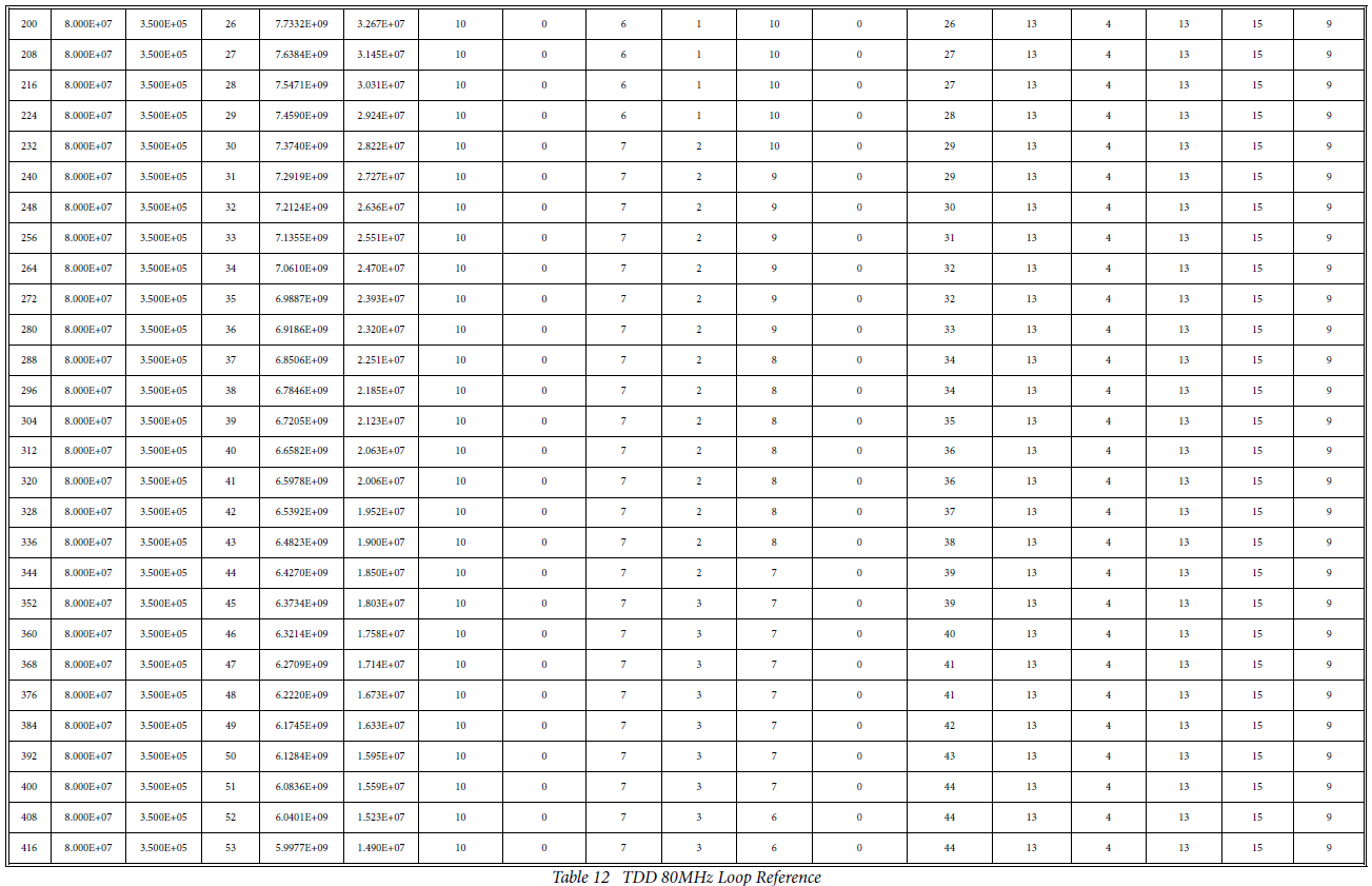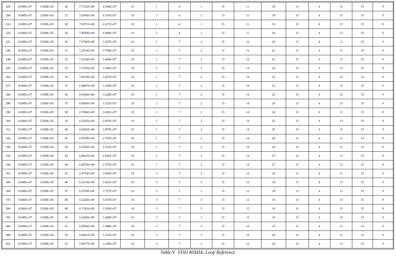 [1] 根据工作模式(TDD/FDD)和鉴相器(即电荷泵)参考频率,从6个表中选择一个。