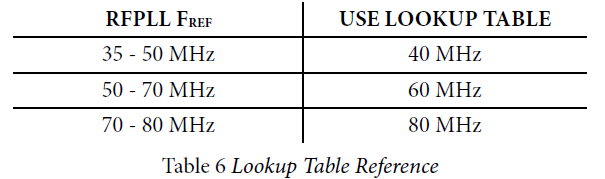 ADI给了6张表,分别是在TDD和FDD模式下,电荷泵输入的参考信号频率为40MHz,60MHz和80MHz时的配置。电荷泵实际输入参考信号频率与表的对应关系是: