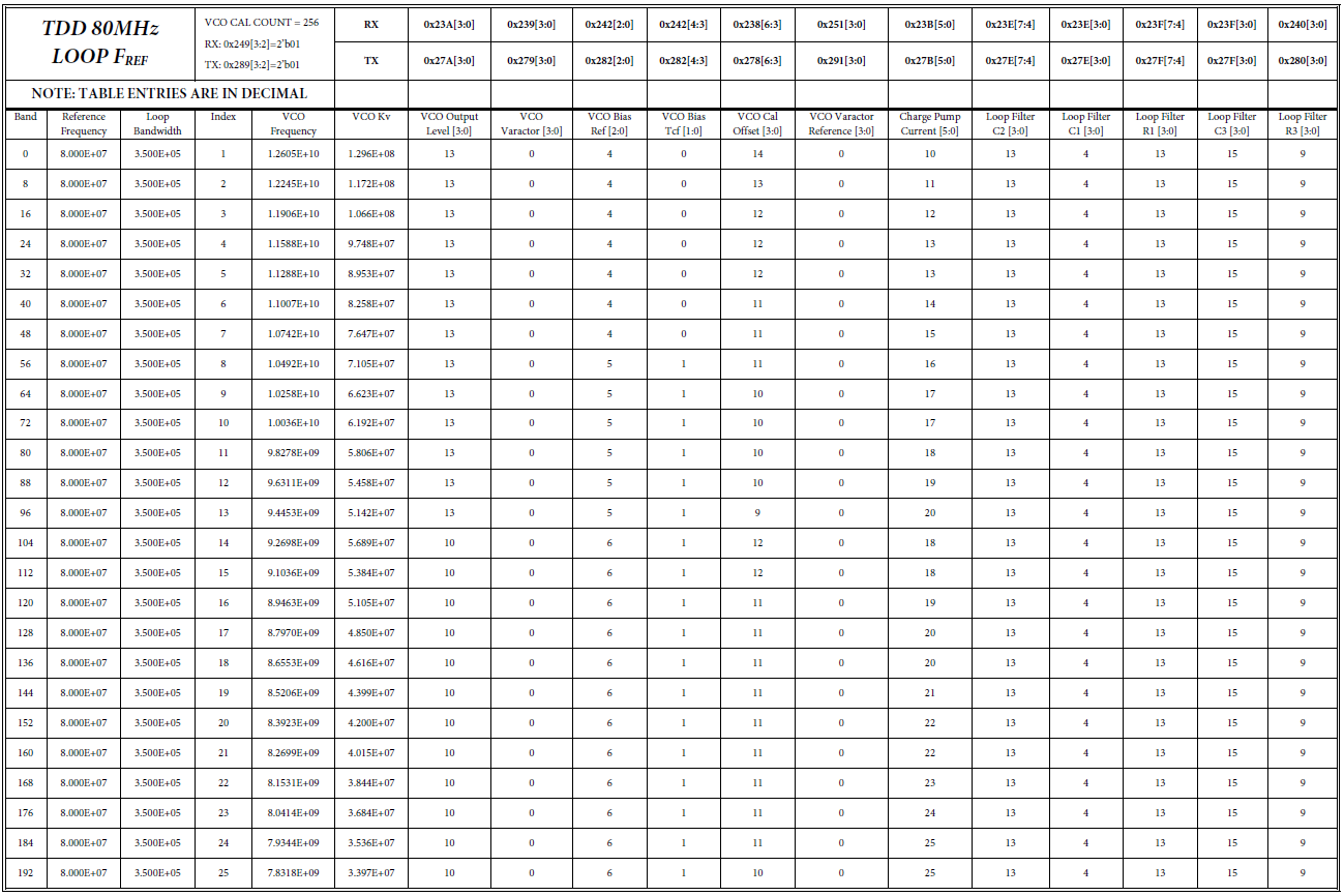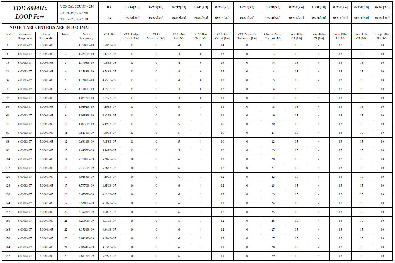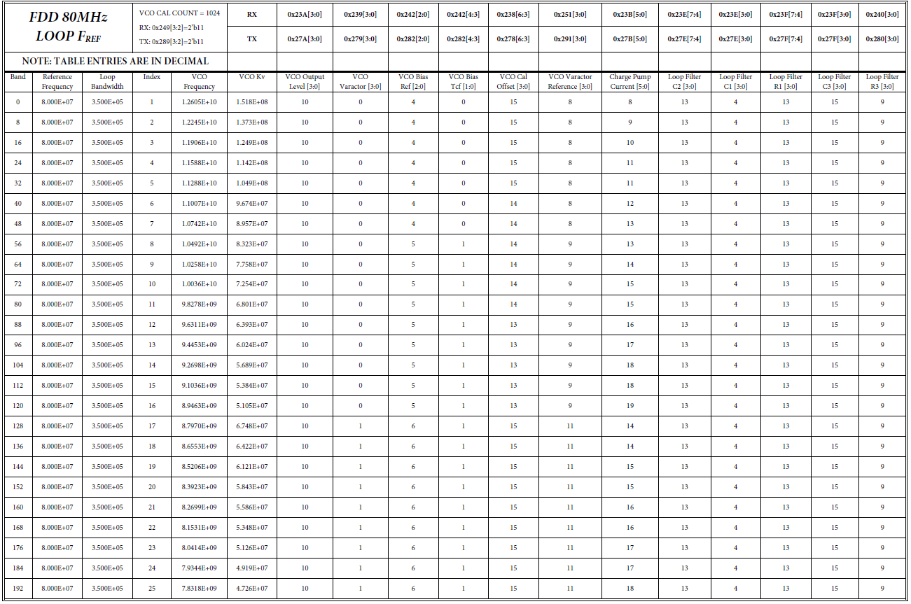 [3] 注意:每个表的表头有VCO CAL COUNT值,表示VCO频率校准计数长度,可能的值为128,256,512,1024.(详见VCO部分)在TDD模式下,VCO校准时间短,不进行温度补偿;在FDD模式下,VCO校准时间长,并且进行温度补偿。