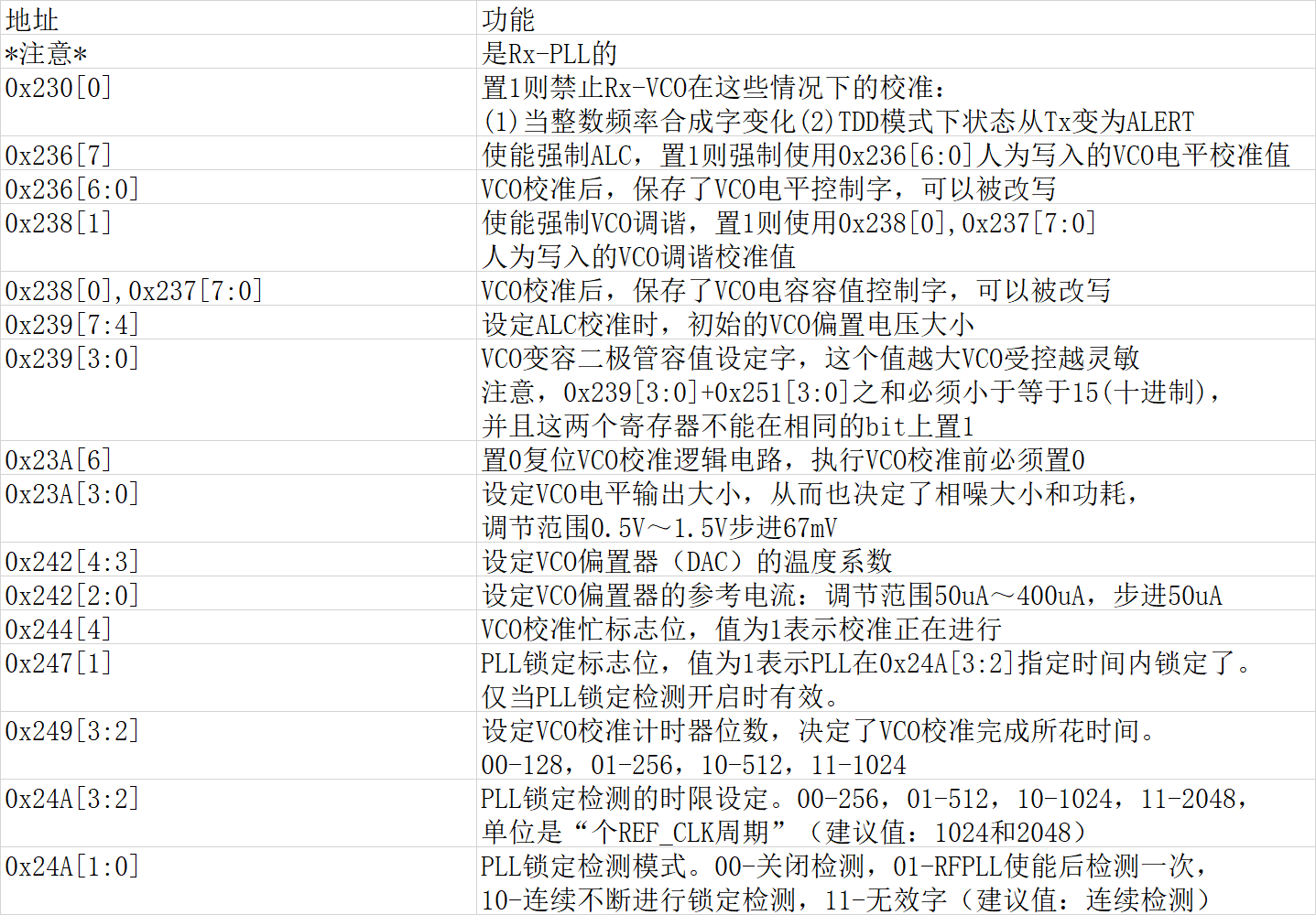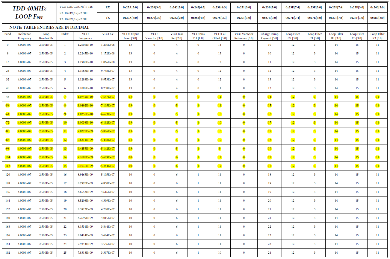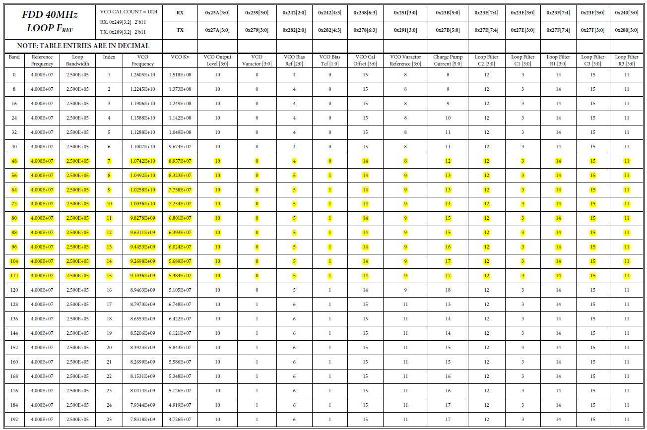 [3] 注意:每个表的表头有VCO CAL COUNT值,表示VCO频率校准计数长度,可能的值为128,256,512,1024.(详见VCO部分)在TDD模式下,VCO校准时间短,不进行温度补偿;在FDD模式下,VCO校准时间长,并且进行温度补偿。