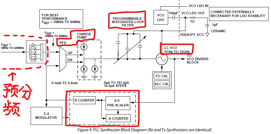 其中F_REF是RF-PLL的输入参考频率,和上面的REF_CLK是一回事。F_RFPLL是VCO的输出频率(注意这个频率范围是6GHz~12GHz)。