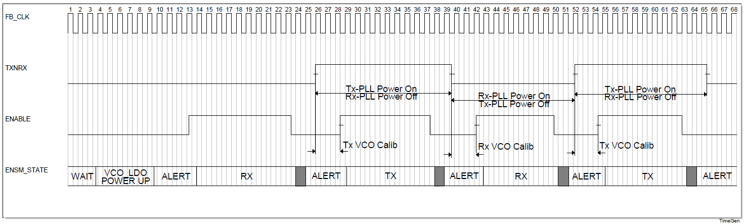 在ALERT状态下,如果TXNRX信号从0变1,则Rx-PLL掉电休眠,Tx-PLL上电工作;如果TXNRX信号由1变0,则Rx-PLL上电工作,Tx-PLL掉电休眠。时序图标出了TDD模式下收发VCO进行校准的时机。