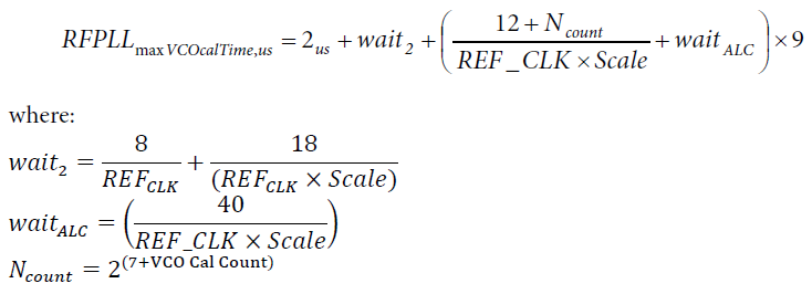 clc; clear; close all; %% Basic Param REF_CLK = 40; % MHz SCALE = 2; % Pre-scaler Factor VCO_CAL_COUNT = 3; % 0->127, 1->256, 2->512, 3->1024 %% Derived Param wait_2 = 8/REF_CLK + 18/(REF_CLK*SCALE); wait_alc = 40/(REF_CLK*SCALE); N_count = 2^(7+VCO_CAL_COUNT); %% max_calib_time_us = 2 + wait_2 + 9*((12+N_count)/(REF_CLK*SCALE) + wait_alc); disp(['max RF-PLL Calib Time = ', num2str(max_calib_time_us), 'us']);