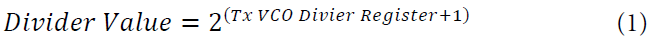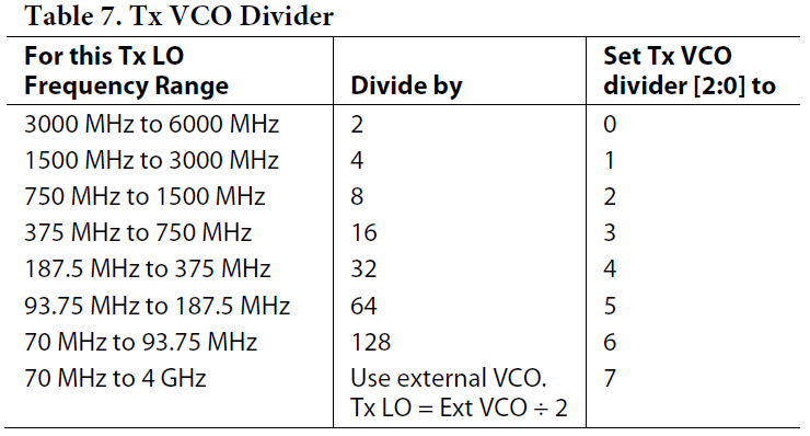 [2] 根据VCO的频率,选择合适的一行。先根据需要的本振频率,确定RF-PLL中VCO的频率。本振频率和VCO频率是“2^n”分频的关系,因此对本振频率进行累乘2,使其落在6GHz~12GHz,就得到期望的VCO工作频率Fd。Fd需要大于等于这一行中的VCO Frequency,并且小于上一行的VCO Frequency。该行对应了一组RF-PLL的配置值。