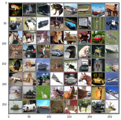 def imshow(img): plt.figure(figsize=(8,8)) img = img / 2 + 0.5 # 转换到 [0,1] 之间 npimg = img.numpy() plt.imshow(np.transpose(npimg, (1, 2, 0))) plt.show() # 得到一组图像 images, labels = iter(trainloader).next() # 展示图像 imshow(torchvision.utils.make_grid(images)) # 展示第一行图像的标签 for j in range(8): print(classes[labels[j]])